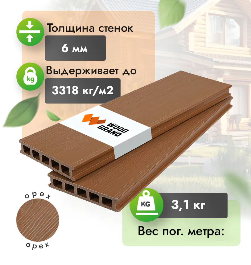 Наша террасная доска из ДПК выдерживает до 3318 кг/м2, влагостойкая, не требует ухода.
