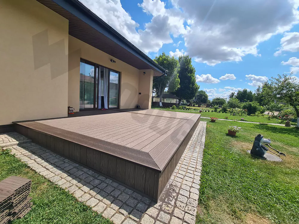 Клиентка Оксана проживает в современном доме под Самарой. По запросу её интересовала именно минималистичный открытая терраса к дому. К данному проекту сразу определились с цветом – выбрали Венге, теплое сочетание цветов добавило уюта и создало ощущение цельности картинки.